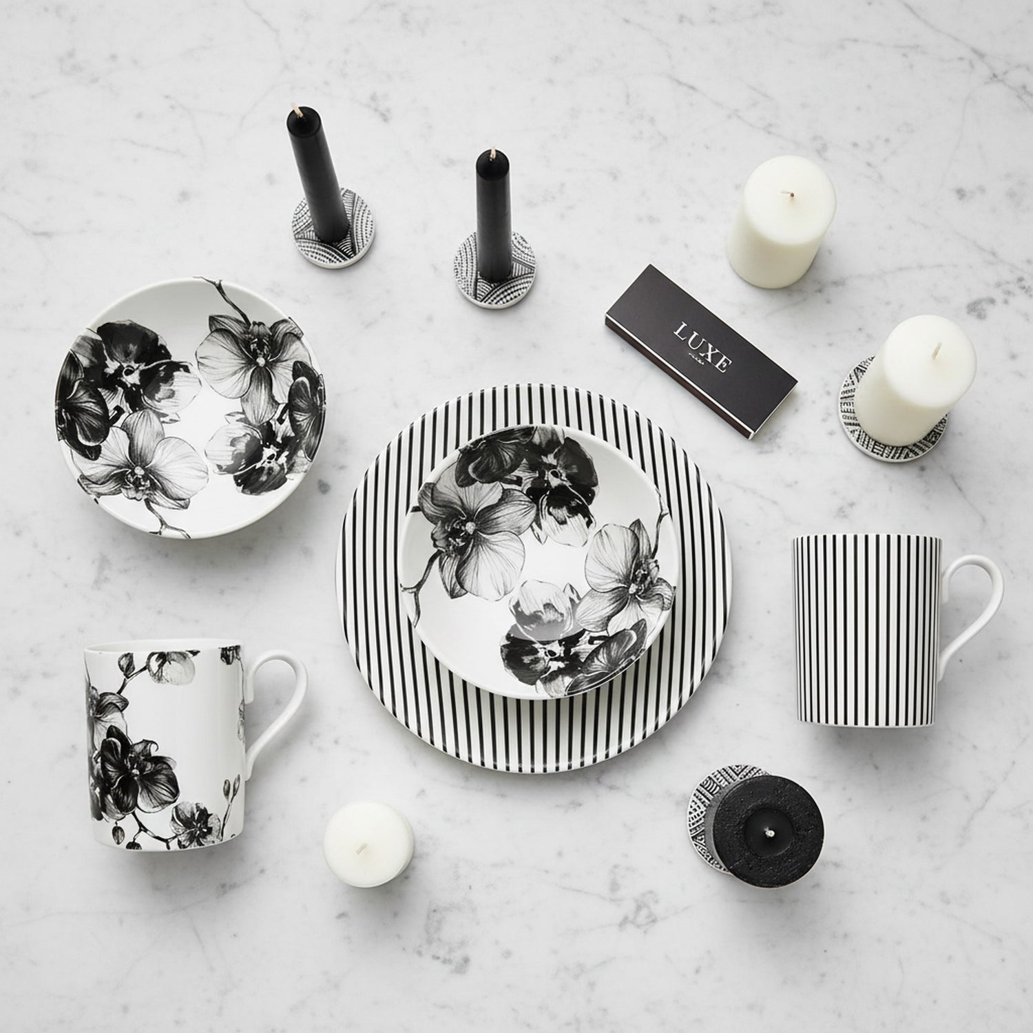 The Noir Signature Collection is a timeless expression of modern luxury, where striking black and white design meets refined British craftsmanship. Featuring elegant mix-and-match patterns of bold stripes and delicate black orchids, each piece is crafted from the finest bone china for a beautifully light yet durable finish. This sophisticated collection brings enduring style and understated drama to any table.